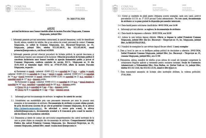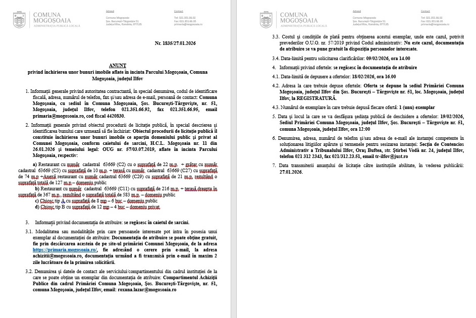 - Informații generale privind obiectul procedurii de licitație publică, în special descrierea și identificarea bunului care urmează să fie închiriat: Obiectul procedurii de licitație publică îl constituie închirierea unor bunuri imobile ce aparțin domeniului public și privat al Comunei Mogoșoaia, conform caietului de sarcini, H.C.L. Mogoșoaia nr. 11 din 26.01.2026 și temeiului legal: OUG nr. 57/03.07.2019, aflate în incinta Parcului Mogoșoaia, respectiv: