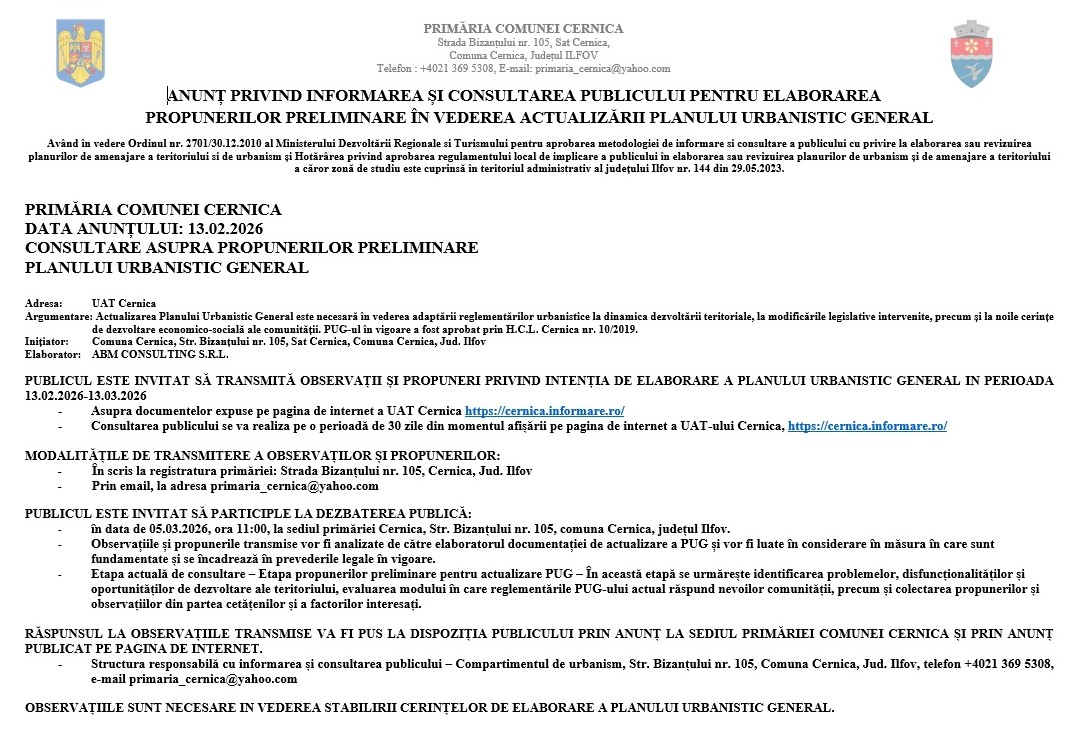 - Consultarea publicului se va realiza pe o perioadă de 30 zile din momentul afișării pe pagina de internet a UAT-ului Cernica, https://cernica.informare.ro/