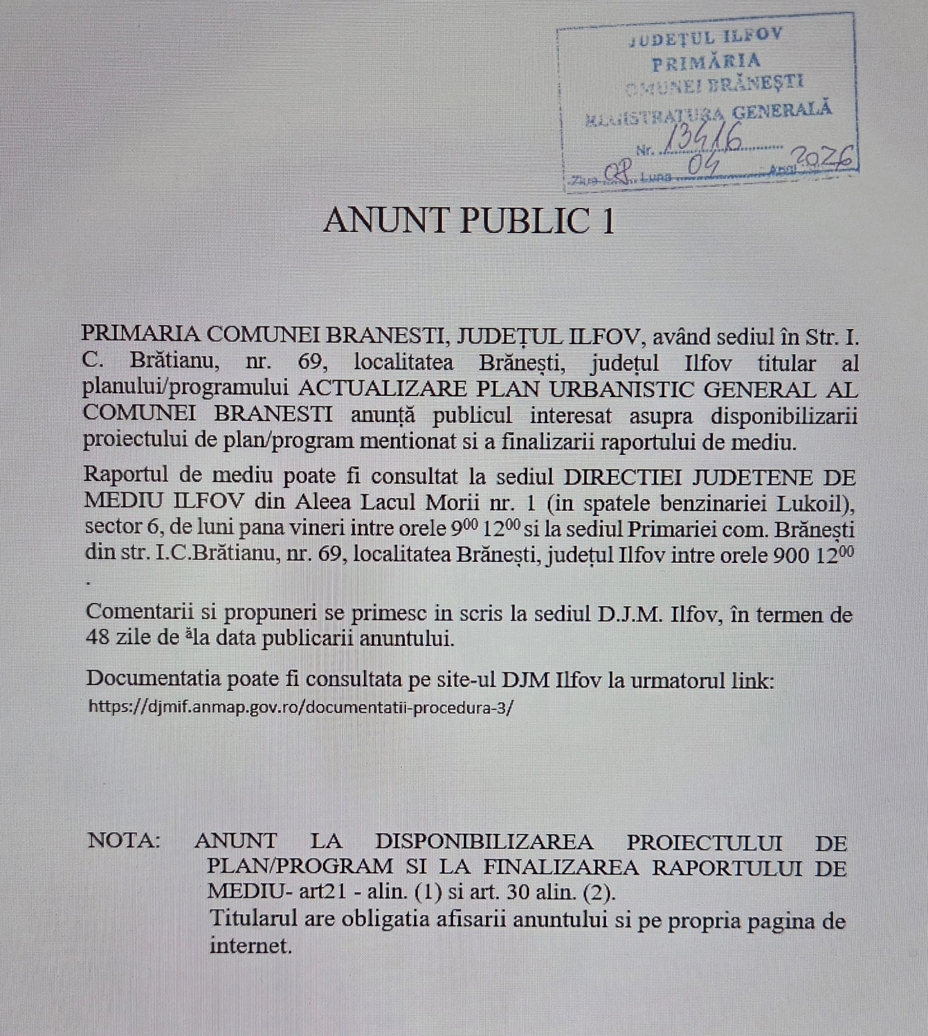 PRIMARIA COMUNEI BRANESTI, JUDEȚUL ILFOV, având sediul în Str. I. C. Brătianu, nr. 69, localitatea Brănești, județul Ilfov titular al planului/programului ACTUALIZARE PLAN URBANISTIC GENERAL AL COMUNEI BRANESTI anunță publicul interesat asupra disponibilizarii proiectului de plan/program mentionat si a finalizarii raportului de mediu.