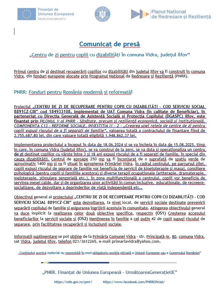 Comunicat de presă – ”Centru de zi pentru copiii cu dizabilități în comuna Vidra, județul Ilfov”
