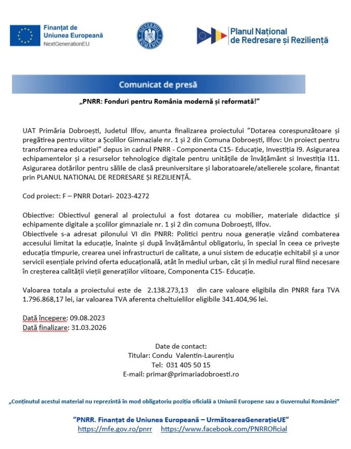 Comunicat de presa – „PNRR: Fonduri pentru România modernă și reformată!” – Dobroești