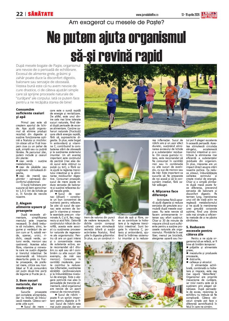 Activitatea fizică ușoară ajută digestia și reduce senzația de greutate acumulată după mesele copioase. Nu este nevoie să facem antrenamente intense sau efort susținut. Chiar și 30 de minute de mișcare zilnică sunt suficiente pentru a susține procesele naturale ale organismului. Plimbările în aer liber, mersul pe bicicletă, alergarea ușoară sau înotul pot fi alegeri excelente în această perioadă. Acestea stimulează circulația sângelui, accelerează tranzitul intestinal și contribuie la eliminarea mai eficientă a substanțelor reziduale din organism. În plus, mișcarea are un impact direct asupra stării noastre psihice. Ea reduce stresul, îmbunătățește calitatea somnului și crește nivelul de energie. Chiar și o simplă plimbare după masă poate face diferența, prevenind senzația de balonare și disconfort digestiv. Pe termen lung, menținerea unui stil de viață activ ne reglează metabolismului și ne ajută la menținerea unei greutăți corporale optime, fiind una dintre cele mai simple și eficiente metode de a ne păstra sănătatea.