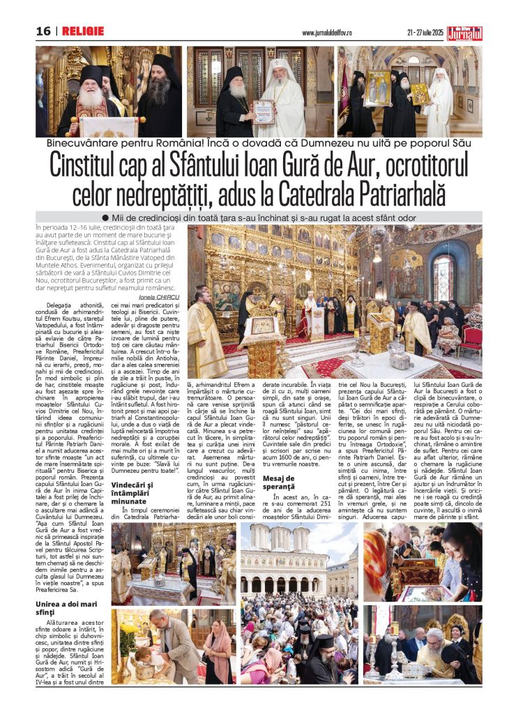 În perioada 12–16 iulie, credincioșii din toată țara au avut parte de un moment de mare bucurie și înălțare sufletească: Cinstitul cap al Sfântului Ioan Gură de Aur a fost adus la Catedrala Patriarhală din București, de la Sfânta Mănăstire Vatoped din Muntele Athos. Evenimentul, organizat cu prilejul sărbătorii de vară a Sfântului Cuvios Dimitrie cel Nou, ocrotitorul Bucureștilor, a fost primit ca un dar neprețuit pentru sufletul neamului românesc.