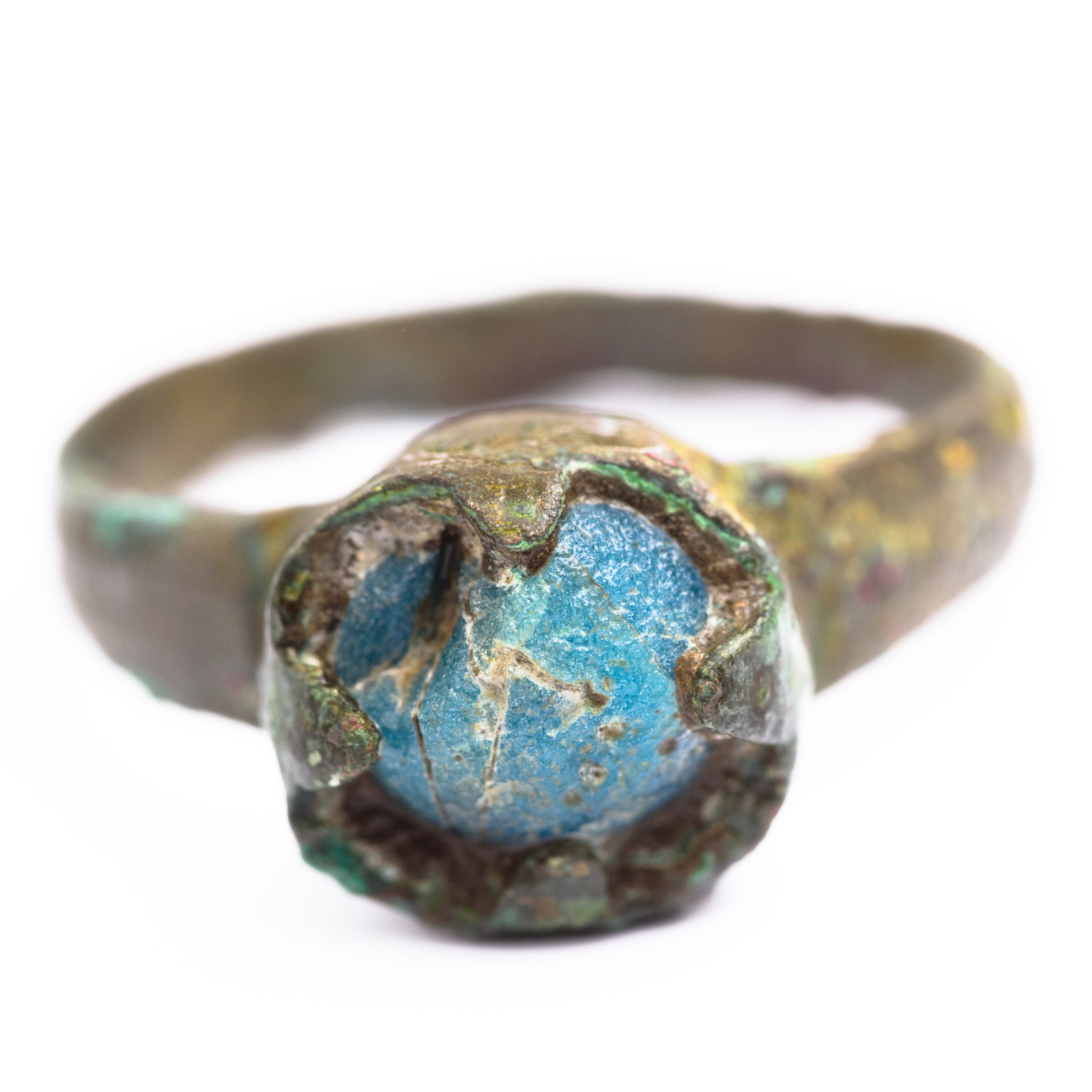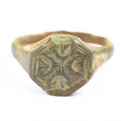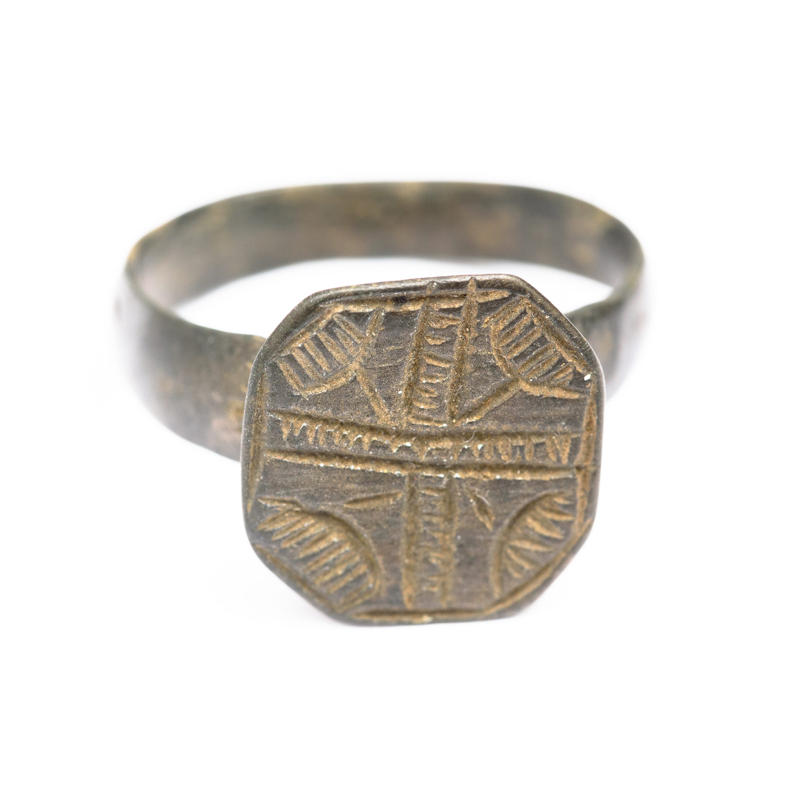 Un inel dintre cele descoperite prezintă o montură împărțită în patru cadrane de o cruce, cu motive florale redate prin linii incizate. Piesa este fin gravată și are o patină verde spectaculoasă. Este posibil să dateze din perioada medievală, probabil între secolele XI-XIV. Un alt inel din bronz ar putea fi un inel sigilar, cu montură ridicată și inscripție gravată, utilizat pentru sigilarea documentelor. Astfel de piese pot proveni fie din perioada romană (secolele II–IV d.Hr.), fie din lumea islamică timpurie (secolele VII–VIII).