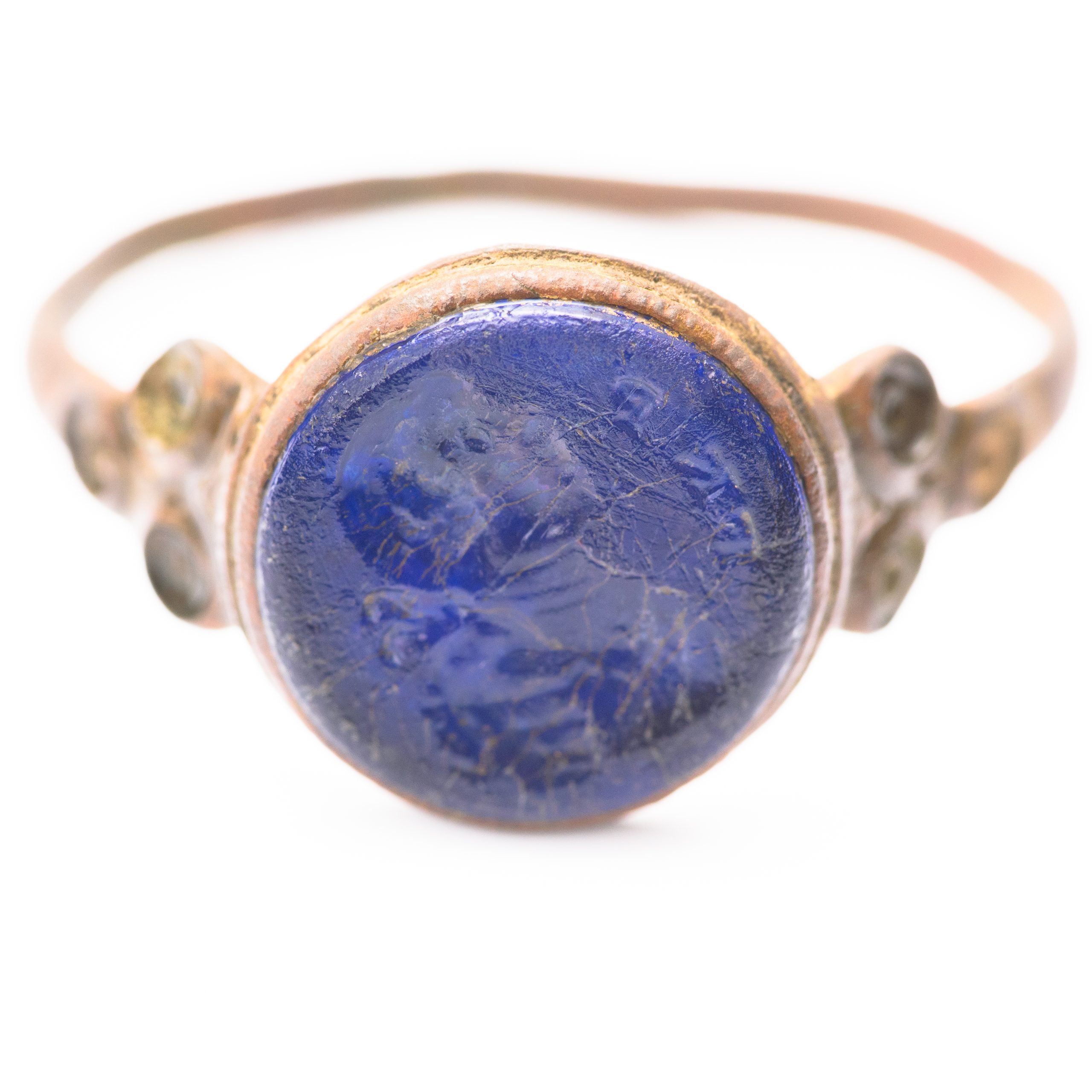 Două inele sunt cu piatră albastru-turcoaz, la unul dintre acestea montura având pe laterale trei mici orificii unde probabil au existat alte pietre decorative. Piatra principală prezintă o inserție (intaglio) cu profilul unui bust, posibil reprezentând o persoană de rang înalt. Piesa ar putea data din perioada medievală târzie sau din epoca modernă timpurie (secolele XVII–XIX).