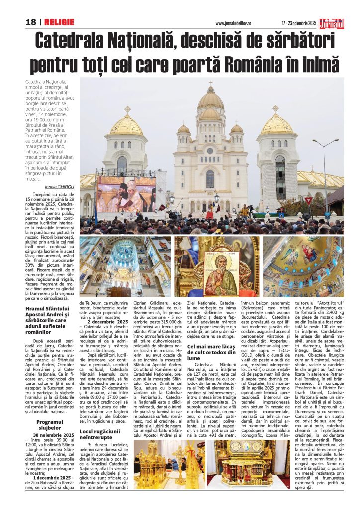 Pe durata lucrărilor, pelerinii care doresc să se roage în apropierea Catedralei Naționale o pot face la Paraclisul Catedralei Naționale, aflat în vecinătate, unde slujbele și rugăciunile sunt oficiate cu dragoste și dăruire de către părintele arhimandrit Ciprian Grădinaru, eclesiarhul lăcașului de cult. Reamintim că, în perioada 26 octombrie – 5 noiembrie, peste 315.000 de credincioși au trecut prin Sfântul Altar al Catedralei, într-o atmosferă de intensă trăire duhovnicească, prilejuită de sfințirea noilor lucrări în mozaic. Pelerinii au avut ocazia de a se închina la moaștele Sfântului Apostol Andrei, Ocrotitorul României și al Catedralei Naționale, precum și la moaștele Sfântului Cuvios Dimitrie cel Nou, aduse cu binecuvântare de la Catedrala Patriarhală. Catedrala Națională este o clădire măreață, dar și o inimă de piatră și lumină în care pulsează sufletul românesc, rod al credinței, al jertfei și al iubirii de neam. Cu prilejul sărbătorii Sfântului Apostol Andrei și al Zilei Naționale, Catedrala ne vorbește cu inima despre rădăcinile noastre adânci și despre faptul că adevărata măreție a unui popor izvorăște din credință, unitate și din nădejdea care nu se stinge.