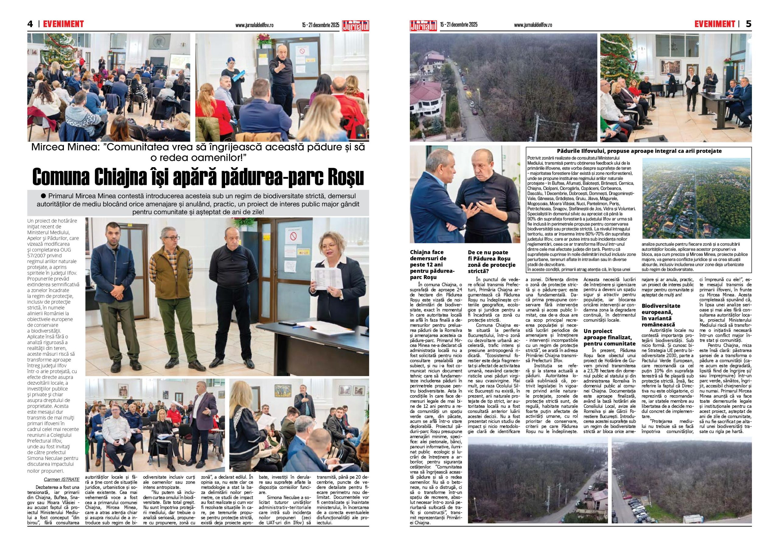 statele membre au libertatea de a decide modul concret de implementare. ”Protejarea mediului nu trebuie să se facă împotriva comunităților, ci împreună cu ele!”, este mesajul transmis de primarii ilfoveni, în frunte cu Mircea Minea. Acesta completează spunând că, în lipsa unei analize serioase și mai ales fără consultarea autorităților locale, proiectul Ministerului Mediului riscă să transforme o inițiativă necesară într-un conflict major între stat și comunități. Pentru Chiajna, miza este însă clară: păstrarea șansei de a transforma o pădure a comunității (care acum este degradată, lipsită fiind de îngrijire și/sau împrejmuire) într-un parc verde, sănătos, îngrijit, accesibil chiejnenilor și nu numai. Primarul Mircea Minea anunță că va face toate demersurile legale și instituționale pentru ca acest proiect, așteptat de ani de zile de comunitate, să nu fie sacrificat pe altarul unei biodiversități trasate cu rigla pe hartă.