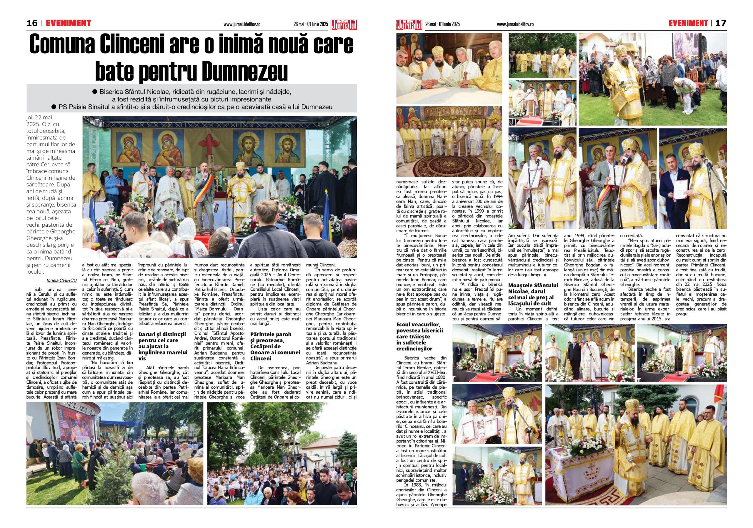 Joi, 22 mai 2025. O zi cu totul deosebită, înmiresmată de parfumul florilor de mai și de mireasma tămâii înălțate către Cer, avea să îmbrace comuna Clinceni în haine de sărbătoare. După ani de trudă și jertfă, după lacrimi și speranțe, biserica cea nouă, așezată pe locul celei vechi, păstorită de părintele Gheorghe Gheorghe, și-a deschis larg porțile ca o inimă bătând pentru Dumnezeu și pentru oamenii locului.