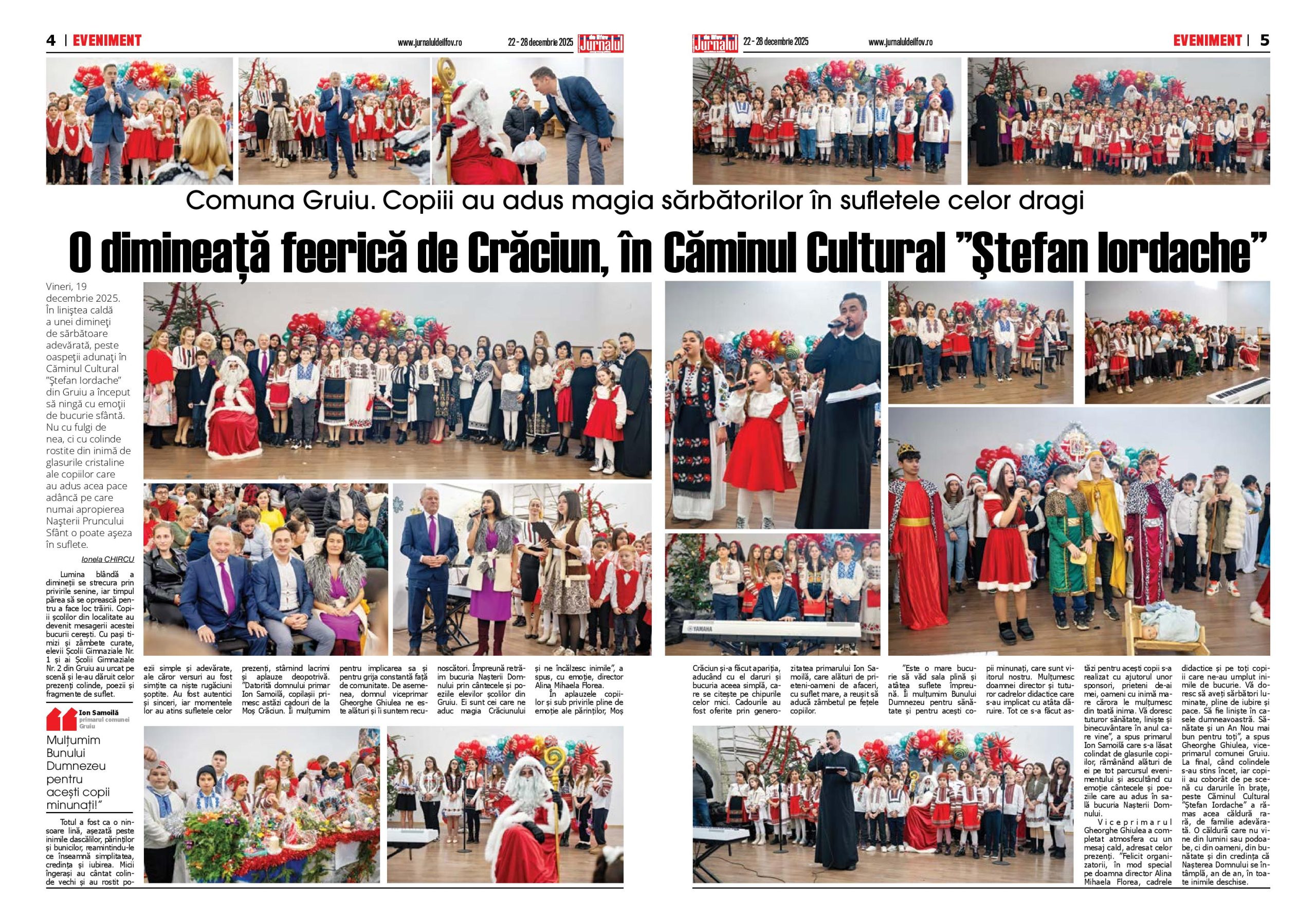 Lumina blândă a dimineții se strecura prin privirile senine, iar timpul părea să se oprească pentru a face loc trăirii. Copiii școlilor din localitate au devenit mesagerii acestei bucurii cerești. Cu pași timizi și zâmbete curate, elevii Școlii Gimnaziale Nr. 1 și ai Școlii Gimnaziale Nr. 2 din Gruiu au urcat pe scenă și le-au dăruit celor prezenți colinde, poezii și fragmente de suflet. Totul a fost ca o ninsoare lină, așezată peste inimile dascălilor, părinților și bunicilor, reamintindu-le ce înseamnă simplitatea, credința și iubirea. Micii îngerași au cântat colinde vechi și au rostit poezii simple și adevărate, ale căror versuri au fost simțite ca niște rugăciuni șoptite. Au fost autentici și sinceri, iar momentele lor au atins sufletele celor prezenți, stârnind lacrimi și aplauze deopotrivă. ”Datorită domnului primar Ion Samoilă, copilașii primesc astăzi cadouri de la Moș Crăciun. Îi mulțumim pentru implicarea sa și pentru grija constantă față de comunitate. De asemenea, domnul viceprimar Gheorghe Ghiulea ne este alături și îi suntem recunoscători. Împreună retrăim bucuria Nașterii Domnului prin cântecele și poeziile elevilor școlilor din Gruiu. Ei sunt cei care ne aduc magia Crăciunului și ne încălzesc inimile”, a spus, cu emoție, director Alina Mihaela Florea. În aplauzele copiilor și sub privirile pline de emoție ale părinților, Moș Crăciun și-a făcut apariția, aducând cu el daruri și bucuria aceea simplă, care se citește pe chipurile celor mici. Cadourile au fost oferite prin generozitatea primarului Ion Samoilă, care alături de prieteni-oameni de afaceri, cu suflet mare, a reușit să aducă zâmbetul pe fețele copiilor.