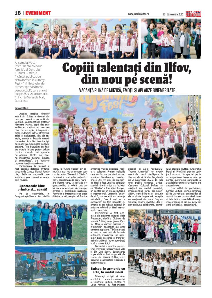 Talentații artiști ai Ansamblului vocal-instrumental al Centrului Cultural Buftea ”A Doua Familie” au fost invitații speciali ai Galei Festivalului ”Vocea Armoniei”, un eveniment de marcă desfășurat la Muzeul de Artă din Constanța pe 2 noiembrie 2025. În fața unui public numeros, artiștii Centrului Cultural Buftea au susținut un recital deosebit, impresionând prin profesionalism, sensibilitate și bucuria de a cânta împreună. Aceștia au mulțumit domnului Bogdan Oancea pentru invitație, dar și pentru buna colaborare, primarului orașului Buftea, Gheorghe Pistol și Primăriei pentru sprijinul acordat, în special pentru asigurarea transportului și pentru susținerea constantă a activităților cultural-artistice ale ansamblului. Prin astfel de participări, Centrul Cultural Buftea continuă să fie un veritabil ambasador al culturii locale, promovând tinerii talentați și consolidând imaginea orașului ca un pol activ de viață artistică și comunitară.