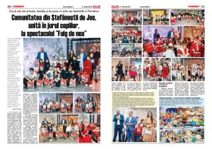 Comuna Ștefăneștii de Jos a fost, în zilele de 17 și 18 decembrie, gazda unuia dintre cele mai așteptate evenimente dedicate copiilor și sărbătorilor de iarnă – spectacolul ”Fulg de nea”. Acesta s-a desfășurat în sala de festivități a Primăriei Ștefăneștii de Jos și a fost pregătit în cele mai mici detalii de elevi, cadre didactice, educatoare și picii de la grădiniță, pregătiri începute din timp și coordonate cu pasiune de directorul cultural Marin Ecaterina. Întreaga activitate a fost susținută de echipa Primăriei comunei Ștefăneștii de Jos, de către primarul Mircea Gheorghiță și directorul școlii din localitate, prof. Ștefan Cristian.