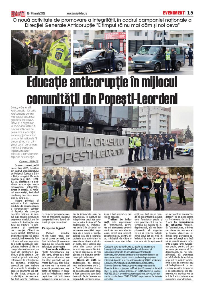 În acest context, pe 18 decembrie 2025, lucrători din cadrul Inspectoratului de Poliție al Județului Ilfov – Poliția orașului Popești-Leodeni și ai DGA – DAMBJI au desfășurat o activitate de educație pentru promovarea integrității, direct în stradă, în mijlocul comunității, facilitând un dialog deschis și accesibil cu cetățenii.