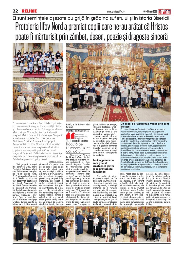 Prin ochii și inimile acestor copii, se întrezărește o lumină nepieritoare, o sinceritate care transfigurează, o dorință profundă de a rămâne aproape de Dumnezeu. Prin lucrările lor, prin felul în care s-au implicat și au colaborat, s-a simțit fiorul unei generații care știe să caute sens, să cinstească jertfa, să prețuiască rădăcinile. Acești copii au participat la un concurs deosebit de important și au deschis, prin cuvânt și faptă, cărări de lumină în inimile noastre, ale tuturor. Ei ne-au învățat că Hristos poate fi mărturisit și prin zâmbet, și prin desen, și prin poezie, și prin dragoste sinceră. Ei sunt semințele unui mâine care zâmbește plin de speranță, semințele așezate cu grijă deopotrivă în grădina sufletului și în istoria Bisericii. Pentru această minunată mărturie de credință, îi felicităm și noi, echipa Jurnalului de Ilfov cu toată recunoștința noastră. Le dorim ca această experiență să le rămână în inimă ca un semn al începutului unei vieți ancorate în credință, curaj și iubire.