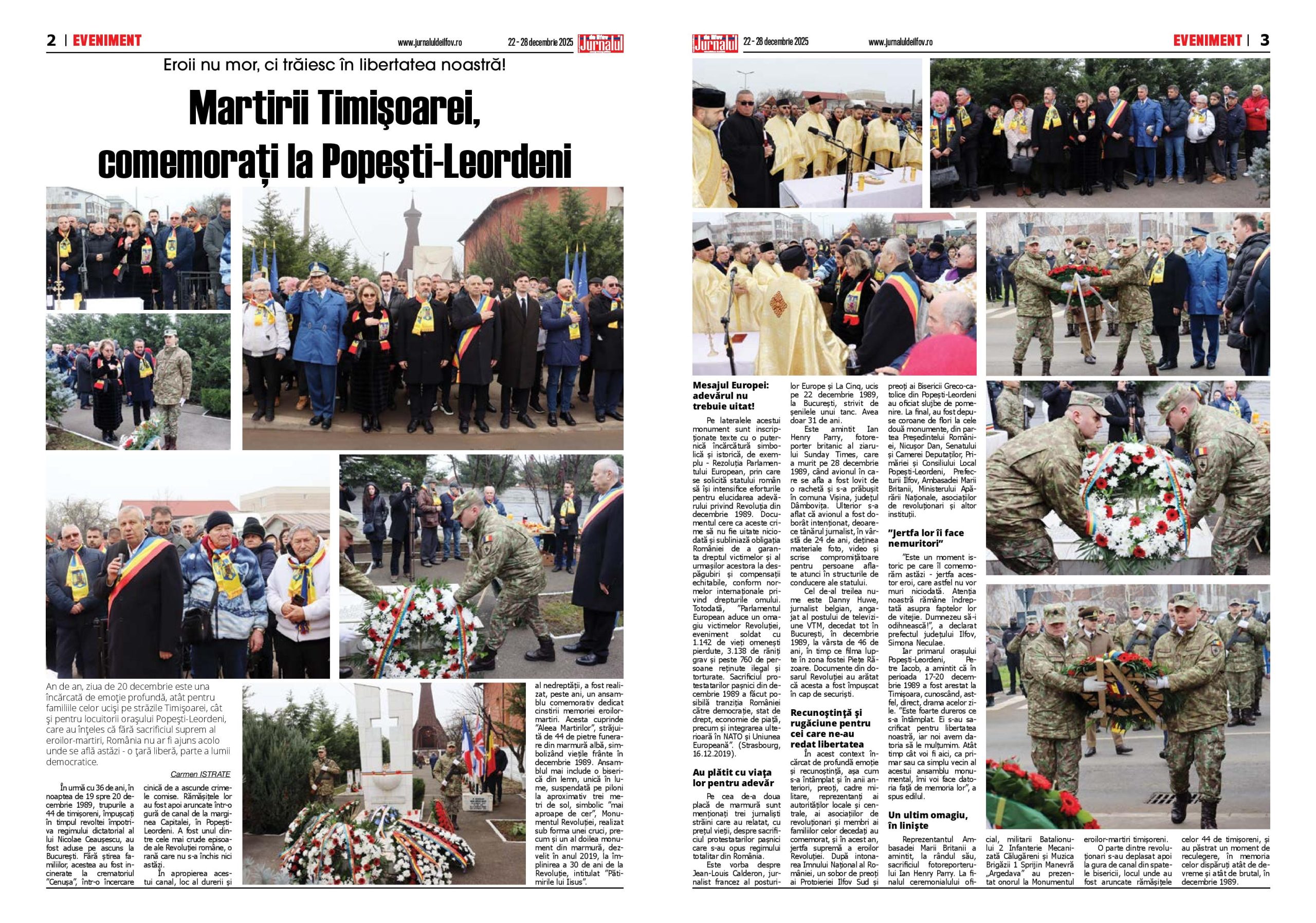 An de an, ziua de 20 decembrie este una încărcată de emoție profundă, atât pentru familiile celor uciși pe străzile Timișoarei, cât și pentru locuitorii orașului Popești-Leordeni, care au înțeles că fără sacrificiul suprem al eroilor-martiri, România nu ar fi ajuns acolo unde se află astăzi – o țară liberă, parte a lumii democratice.