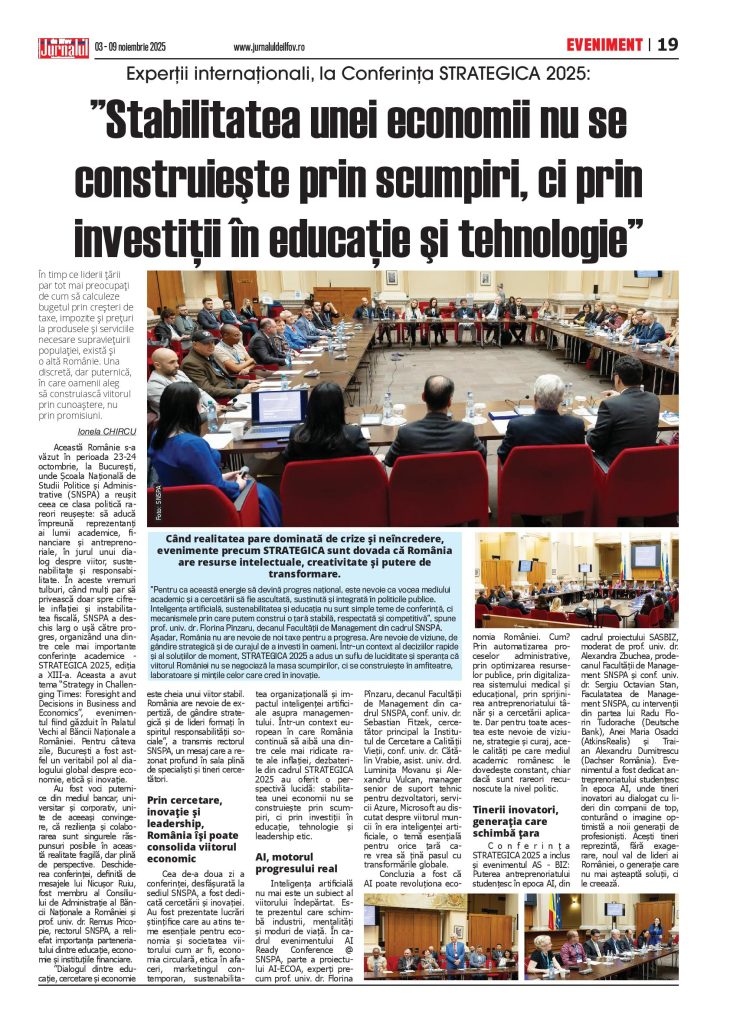 Cea de-a doua zi a conferinței, desfășurată la sediul SNSPA, a fost dedicată cercetării și inovației. Au fost prezentate lucrări științifice care au atins teme esențiale pentru economia și societatea viitorului cum ar fi, economia circulară, etica în afaceri, marketingul contemporan, sustenabilitatea organizațională și impactul inteligenței artificiale asupra managementului. Într-un context european în care România continuă să aibă una dintre cele mai ridicate rate ale inflației, dezbaterile din cadrul STRATEGICA 2025 au oferit o perspectivă lucidă: stabilitatea unei economii nu se construiește prin scumpiri, ci prin investiții în educație, tehnologie și leadership etic.