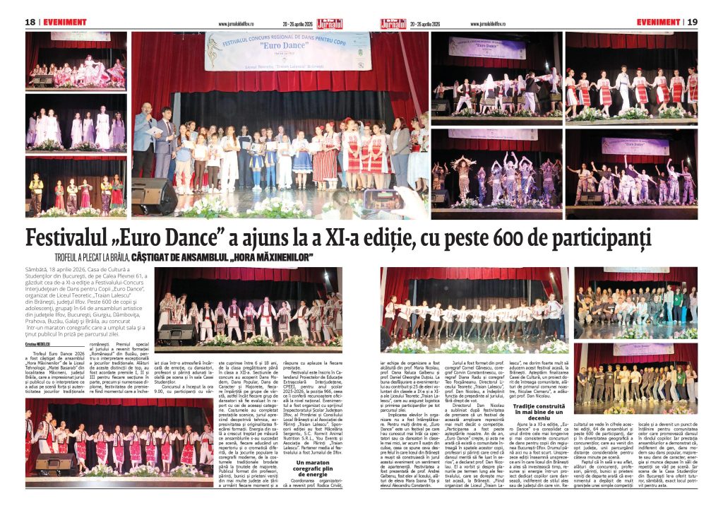 Sâmbătă, 18 aprilie 2026, Casa de Cultură a Studenților din București, de pe Calea Plevnei 61, a găzduit cea de-a XI-a ediție a Festivalului-Concurs Interjudețean de Dans pentru Copii „Euro Dance”, organizat de Liceul Teoretic „Traian Lalescu” din Brănești, județul Ilfov. Peste 600 de copii și adolescenți, grupați în 64 de ansambluri artistice din județele Ilfov, București, Giurgiu, Dâmbovița, Prahova, Buzău, Galați și Brăila, au concurat într-un maraton coregrafic care a umplut sala și a ținut publicul în priză pe parcursul zilei.