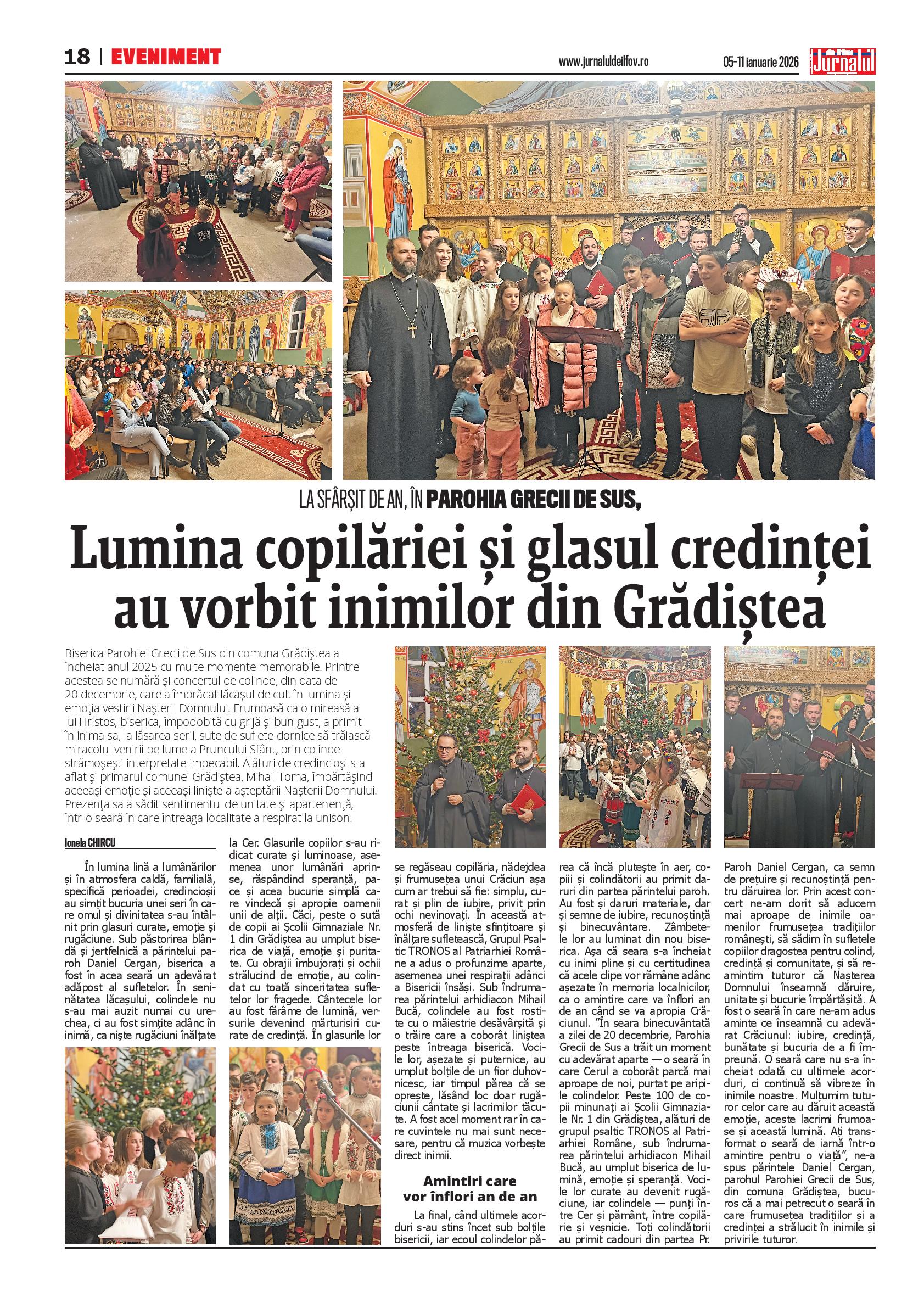 Biserica Parohiei Grecii de Sus din comuna Grădiștea a încheiat anul 2025 cu multe momente memorabile. Printre acestea se numără și concertul de colinde, din data de 20 decembrie, care a îmbrăcat lăcașul de cult în lumina și emoția vestirii Nașterii Domnului. Frumoasă ca o mireasă a lui Hristos, biserica, împodobită cu grijă și bun gust, a primit în inima sa, la lăsarea serii, sute de suflete dornice să trăiască miracolul venirii pe lume a Pruncului Sfânt, prin colinde strămoșești interpretate impecabil. Alături de credincioși s-a aflat și primarul comunei Grădiștea, Mihail Toma, împărtășind aceeași emoție și aceeași liniște a așteptării Nașterii Domnului. Prezența sa a sădit sentimentul de unitate și apartenență, într-o seară în care întreaga localitate a respirat la unison.