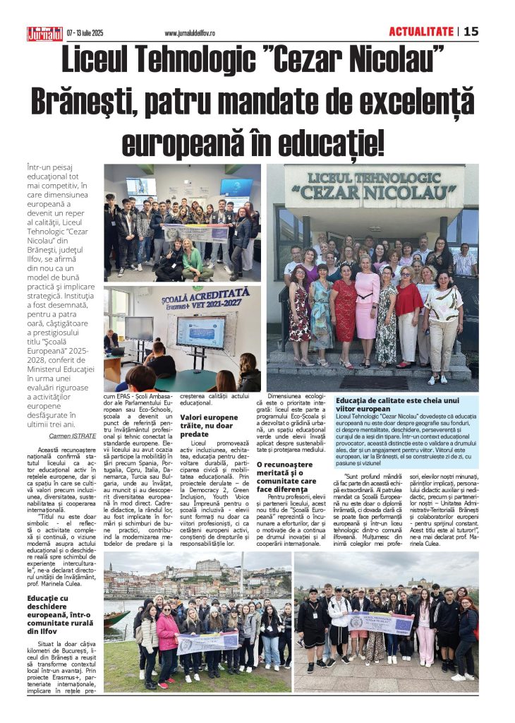 Într-un peisaj educațional tot mai competitiv, în care dimensiunea europeană a devenit un reper al calității, Liceul Tehnologic ”Cezar Nicolau” din Brănești, județul Ilfov, se afirmă din nou ca un model de bună practică și implicare strategică. Instituția a fost desemnată, pentru a patra oară, câștigătoare a prestigiosului titlu ”Școală Europeană” 2025-2028, conferit de Ministerul Educației în urma unei evaluări riguroase a activităților europene desfășurate în ultimii trei ani.