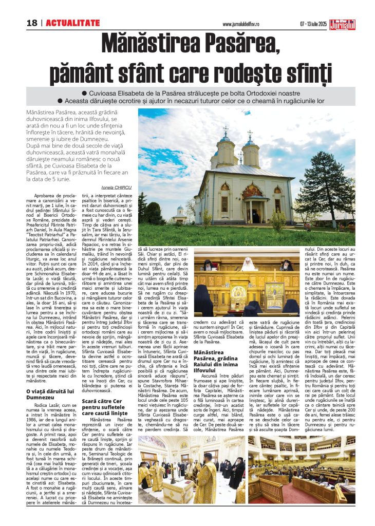 Aprobarea de proclamare a canonizării a venit marți, pe 1 iulie, în cadrul ședinței Sfântului Sinod al Bisericii Ortodoxe Române, prezidate de Preafericitul Părinte Patriarh Daniel, în Aula Magna ”Teoctist Patriarhul” a Palatului Patriarhiei. Canonizarea propriu-zisă, adică proclamarea oficială și includerea sa în calendarul liturgic, va avea loc anul viitor. Puțini sunt cei care au auzit, până acum, despre Schimonahia Elisabeta Lazăr, o viață tăcută, dar plină de lumină, trăită cu smerenie și credință adâncă. Născută în 1970, într-un sat din Bucovina, a ales, la doar 16 ani, să-și lase în urmă tinerețea și lumea pentru a se închina lui Dumnezeu, intrând în obștea Mănăstirii Pasărea. Aici, în mijlocul naturii, între codrii liniștiți și apele care înconjoară mănăstirea ca o binecuvântare, și-a trăit mare parte din viață, în rugăciune, muncă și tăcere, devenind fără să caute vreodată vreo laudă omenească, una dintre cele mai iubite și respectate maici din mănăstire.