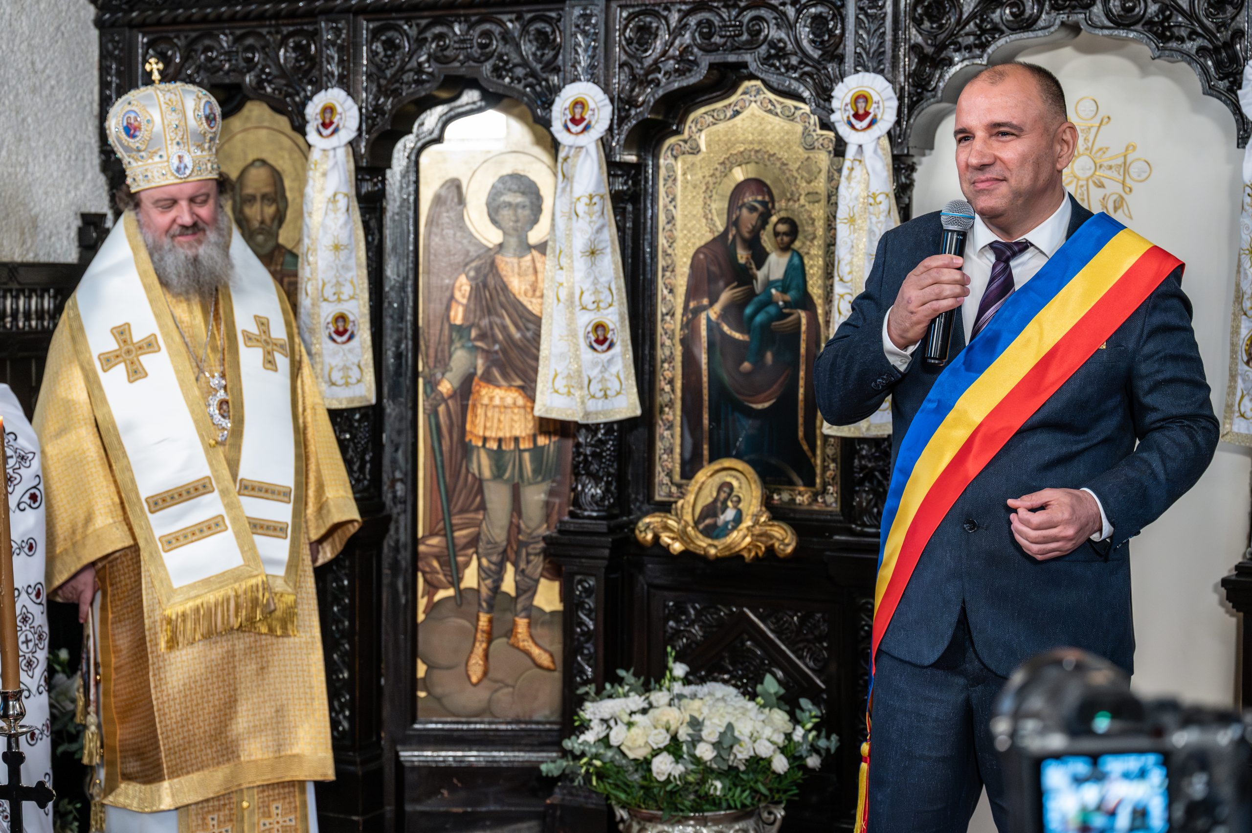 Și, acolo unde este Dumnezeu, totul se umple de lumină sfântă. Ca printr-o minune, de acum înainte, pelerinii vor veni mereu, cu flori, cu lacrimi, cu dorințe și mulțumiri. Sfântul Dimitrie va rămâne aici prieten, ocrotitor și mijlocitor pentru toți cei care îl vor cinsti și îl vor chema în rugăciunile lor. Biserica Parohiei Afumați II va rămâne, până la sfârșitul veacurilor, un izvor de credință, iubire și speranță, o dovadă clară că Dumnezeu nu-i uită niciodată pe cei care-L iubesc. Sub norii fumurii de toamnă târzie, după o slujbă înălțătoare, spre prânz, când candelele ardeau lin și clopotele vesteau bucuria, credincioșii au rostit cu glas tremurat, dar plin de nădejde: ”Binecuvântat ești, Doamne, că ne-ai trimis pe Sfântul Tău Dimitrie, spre întărire, vindecare și pace!”. Reamintim că, an de an, în Parohia Afumați II, Sfântul Dimitrie Izvorâtorul de Mir este cinstit și omagiat în chip deosebit, prin rugăciune sinceră, lumină și iubire curată. Dar parcă mai mult ca niciodată, în această zi închinată Sfinților Arhangheli Mihail și Gavriil, îngerii au coborât pe pământ. Nu numai prin sfințirea săvârșită, ci și prin oamenii care au dăruit din inimă frumusețe și lumină. Corul bisericii a fost desăvârșit, o armonie cerească ce a umplut de emoție sfântul lăcaș. Iar când Maria Coman, cu vocea ei angelică, s-a alăturat cântării, sufletele celor prezenți s-au ridicat parcă la Ceruri, purtate de duhul credinței. În atmosfera de bucurie deplină, primarul comunei Afumați, Gabriel Dumănică și Protopopul Protopopiatului Ilfov Nord, Părintele Cristian Burcea, amândoi purtând nume de îngeri, au fost sărbătoriți cu urale, cântări de ”Mulți ani trăiască!” și buchete de flori albe, simbol al purității și prieteniei. Gesturile simple, dar pline de dragoste, au făcut ca toată lumea să se simtă mai aproape de Cer. Iată că, în această zi frumoasă, la Afumați, Dumnezeu și-a trimis îngerii printre oameni, iar oamenii au știut să-i recunoască.