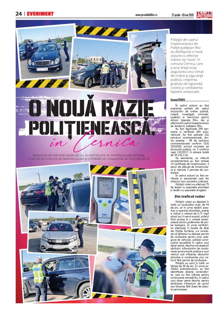 Polițiștii din cadrul Inspectoratului de Poliție Județean Ilfov au desfășurat o nouă acțiune cu efective mărite, tip ”razie”, în comuna Cernica, care a avut drept scop asigurarea unui climat de ordine și siguranță publică, creșterea gradului de siguranță rutieră și combaterea faptelor antisociale.