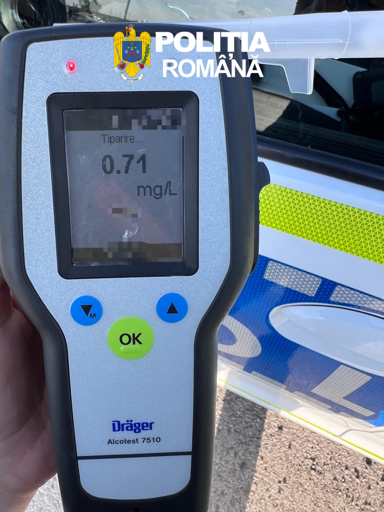 Polițiștii rutieri au depistat în trafic un conducător auto, de 44 de ani, iar în urma testării acestuia cu aparatul alcooltest, acesta a indicat o valoare de 0,71 mg/l alcool pur în aerul expirat, șoferul fiind condus la o unitate spitalicească pentru prelevarea de probe biologice. În urma verificărilor efectuate în bazele de date ale Poliției Române, s-a constatat că bărbatul nu deținea permis de conducere pentru nicio categorie de vehicule, polițiștii continuând cercetările în cadrul unui dosar penal, deschis sub aspectul săvârșirii infracțiunilor de conducerea pe drumurile publice a unui vehicul sub influența băuturilor alcoolice și conducerea unui vehicul fără permis de conducere.