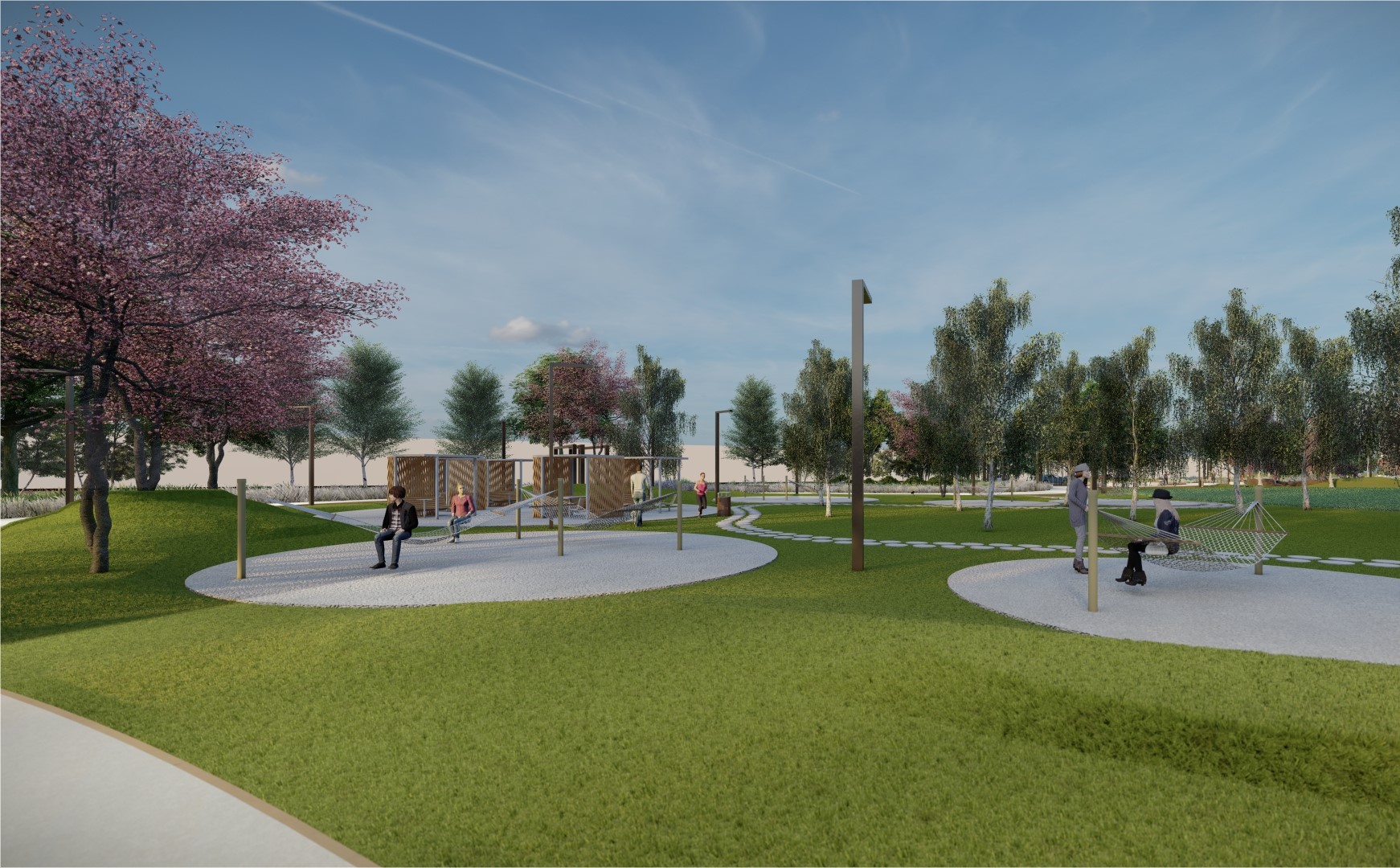 Având acces din aleea principală, locul de joacă pentru copii este o zonă cu contur sinuos, care integrează echipamente de joacă din lemn. Acestea sunt gândite pentru diferite grupe de vârstă și prezintă caracteristicile de siguranță, iar materialele utilizate în construirea lor sunt în concordanță cu atmosfera generală de amenajare a parcului. Mai este propusă și o zonă skatepark și destinată bicicletelor – cu un traseu accentuat cu diverse obstacole și denivelări (pumptrack) pentru dinamism și pentru a încuraja activitatea sportivă.