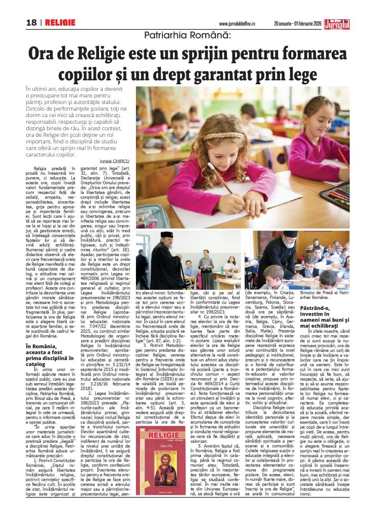 În ultimii ani, educația copiilor a devenit o preocupare tot mai mare pentru părinți, profesori și autoritățile statului. Dincolo de performanțele școlare, toți ne dorim ca cei mici să crească echilibrați, responsabili, respectuoși și capabili să distingă binele de rău. În acest context, ora de Religie din școli are un rol important, fiind o disciplină de studiu care oferă un sprijin real în formarea caracterului copiilor.