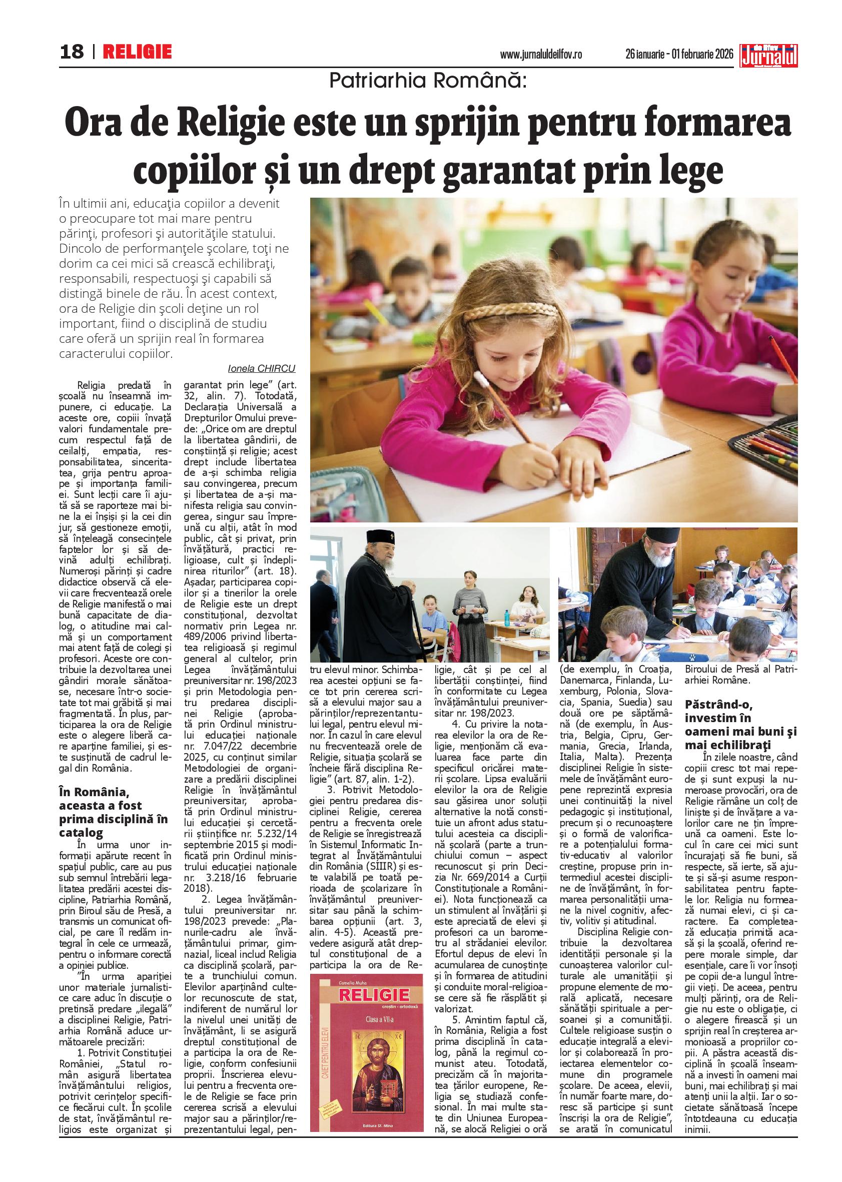 În zilele noastre, când copiii cresc tot mai repede și sunt expuși la numeroase provocări, ora de Religie rămâne un colț de liniște și de învățare a valorilor care ne țin împreună ca oameni. Este locul în care cei mici sunt încurajați să fie buni, să respecte, să ierte, să ajute și să-și asume responsabilitatea pentru faptele lor. Religia nu formează numai elevi, ci caractere. Ea completează educația primită acasă și la școală, oferind repere morale simple, dar esențiale, care îi vor însoți pe copii de-a lungul întregii vieți. De aceea, pentru mulți părinți, ora de Religie nu este o obligație, ci o alegere firească și un sprijin real în creșterea armonioasă a propriilor copii. A păstra această disciplină în școală înseamnă a investi în oameni mai buni, mai echilibrați și mai atenți unii la alții. Iar o societate sănătoasă începe întotdeauna cu educația inimii.