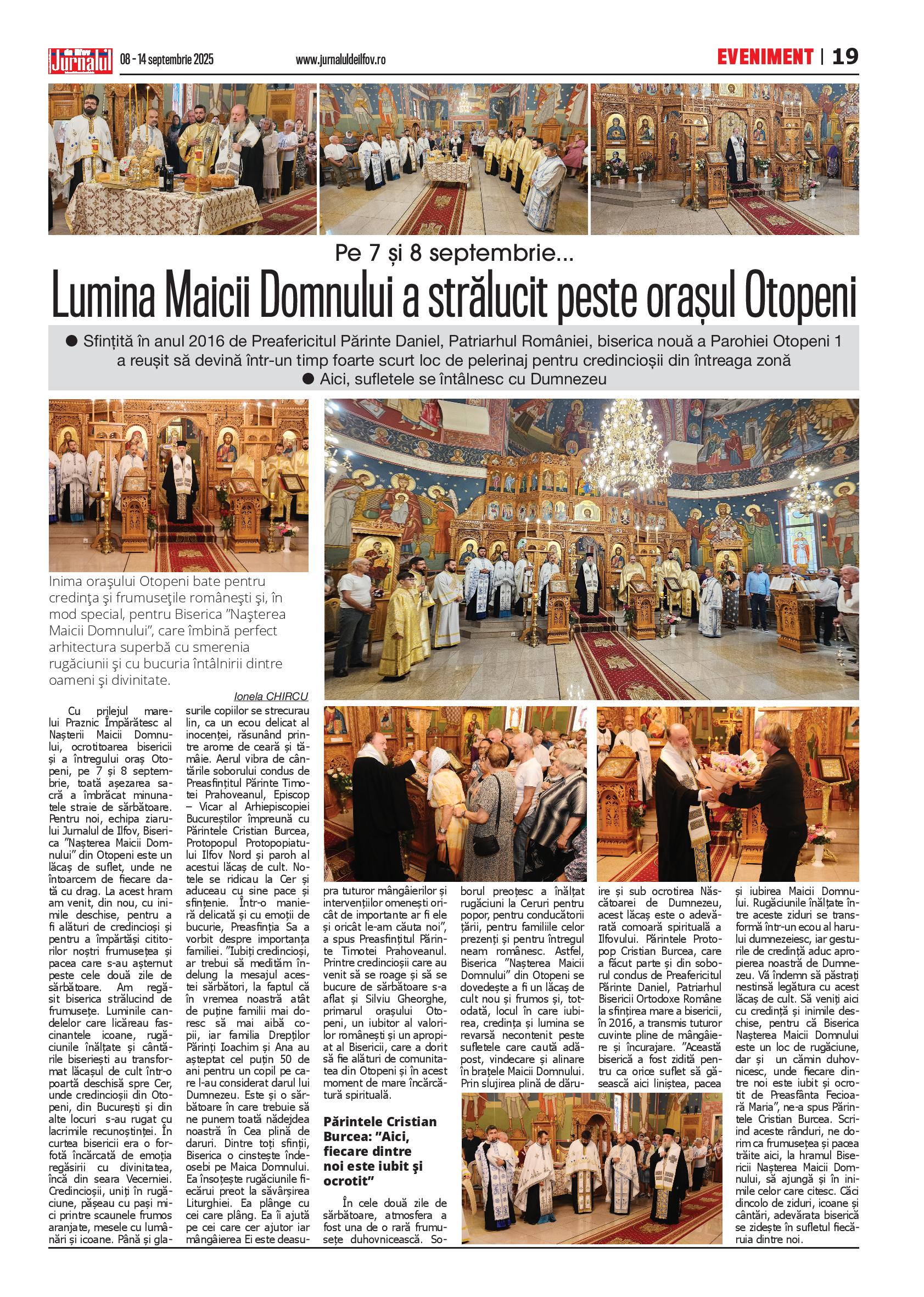 În cele două zile de sărbătoare, atmosfera a fost una de o rară frumusețe duhovnicească. Soborul preoțesc a înălțat rugăciuni la Ceruri pentru popor, pentru conducătorii țării, pentru familiile celor prezenți și pentru întregul neam românesc. Astfel, Biserica ”Nașterea Maicii Domnului” din Otopeni se dovedește a fi un lăcaș de cult nou și frumos și, totodată, locul în care iubirea, credința și lumina se revarsă necontenit peste sufletele care caută adăpost, vindecare și alinare în brațele Maicii Domnului. Prin slujirea plină de dăruire și sub ocrotirea Născătoarei de Dumnezeu, acest lăcaș este o adevărată comoară spirituală a Ilfovului. Părintele Protopop Cristian Burcea, care a făcut parte și din soborul condus de Preafericitul Părinte Daniel, Patriarhul Bisericii Ortodoxe Române la sfințirea mare a bisericii, în 2016, a transmis tuturor cuvinte pline de mângâiere și încurajare. ”Această biserică a fost zidită pentru ca orice suflet să găsească aici liniștea, pacea și iubirea Maicii Domnului. Rugăciunile înălțate între aceste ziduri se transformă într-un ecou al harului dumnezeiesc, iar gesturile de credință aduc apropierea noastră de Dumnezeu. Vă îndemn să păstrați nestinsă legătura cu acest lăcaș de cult. Să veniți aici cu credință și inimile deschise, pentru că Biserica Nașterea Maicii Domnului este un loc de rugăciune, dar și un cămin duhovnicesc, unde fiecare dintre noi este iubit și ocrotit de Preasfânta Fecioară Maria”, ne-a spus Părintele Cristian Burcea. Scriind aceste rânduri, ne dorim ca frumusețea și pacea trăite aici, la hramul Bisericii Nașterea Maicii Domnului, să ajungă și în inimile celor care citesc. Căci dincolo de ziduri, icoane și cântări, adevărata biserică se zidește în sufletul fiecăruia dintre noi.