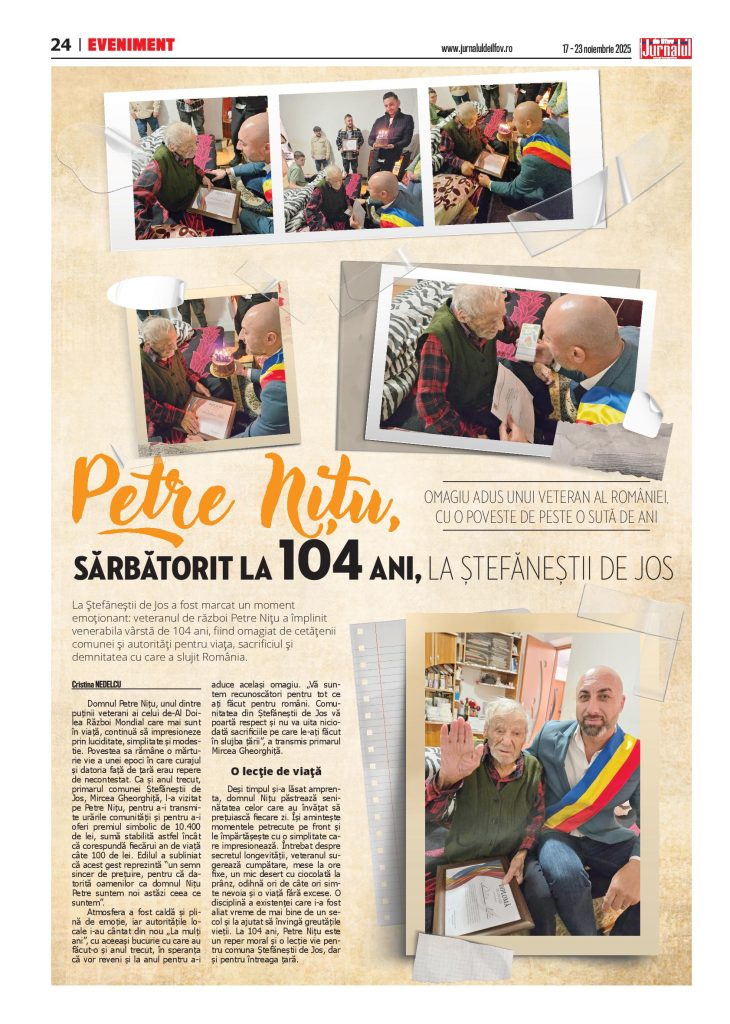 Domnul Petre Nițu, unul dintre puținii veterani ai celui de-Al Doilea Război Mondial care mai sunt în viață, continuă să impresioneze prin luciditate, simplitate și modestie. Povestea sa rămâne o mărturie vie a unei epoci în care curajul și datoria față de țară erau repere de necontestat. Ca și anul trecut, primarul comunei Ștefăneștii de Jos, Mircea Gheorghiță, l-a vizitat pe Petre Nițu, pentru a-i transmite urările comunității și pentru a-i oferi premiul simbolic de 10.400 de lei, sumă stabilită astfel încât că corespundă fiecărui an de viață câte 100 de lei. Edilul a subliniat că acest gest reprezintă “un semn sincer de prețuire, pentru că datorită oamenilor ca domnul Nițu Petre suntem noi astăzi ceea ce suntem”.