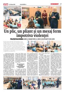 Elevii au primit, de asemenea, un pliant informativ, conceput ca un ghid practic pentru situațiile de risc. Materialul a inclus recomandări clare despre evitarea anturajelor cu comportament antisocial, importanța refuzului consumului de alcool, tutun sau substanțe psihoactive și necesitatea de a nu răspunde violenței cu violență. Un accent aparte a este pus pe ideea de a vorbi cu un adult de încredere și de a nu păstra secretul atunci când cineva este victima sau martorul unei fapte de violență, mesaj sintetizat în îndemnul „Scoate violența școlară din anonimat” .