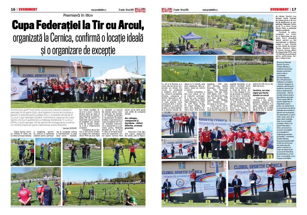 ”Cernica face sport!” este motto-ul local care a devenit realitate în perioada 24-26 aprilie 2026, când Stadionul Central din localitate a găzduit, în premieră pentru județul Ilfov, o competiție oficială de tir cu arcul: Cupa Federației Outdoor. Evenimentul, organizat de Clubul Sportiv Cernica în parteneriat cu Federația Română de Tir cu Arcul (FRTA), a reunit aproape 100 de sportivi din întreaga țară și a marcat un moment important pentru dezvoltarea acestei discipline.