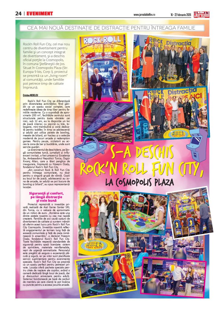 Rock’n Roll Fun City se diferențiază prin diversitatea activităților, fiind gândit ca un spațiu social complet, care redefinește ideea de timp liber pentru familiile moderne. Cu o suprafață de aproximativ 200 m², facilitățile centrului sunt structurate pentru toate vârstele: cei mici, sub 12 ani, au la dispoziție un loc de joacă interior, cu piscină cu bile, tobogane, mini-trambulină și zonă dedicată pentru toddler, în timp ce adolescenții și adulții pot utiliza pistele de bowling, mesele de biliard, air hockey și o selecție modernă de jocuri arcade și redemption games. Pentru pauze, vizitatorii au acces la zona de bar și bucătărie, unde sunt servite gustări. La evenimentul de deschidere, pe lângă comunitatea turcă, jurnaliștii și influencerii invitați, a fost prezent și Excelența Sa, Ambasadorul Republicii Turcia, Özgür Kıvanç Altan, care a tăiat panglica de inaugurare, împreună cu Hüseyin Özalp, fondatorul Rock’n Roll Fun City. „Am construit Rock & Roll Fun City pentru întreaga comunitate, nu doar pentru o singură grupă de vârstă. Copiii au locul lor de joacă, adolescenții au zona de arcade, iar adulții se pot bucura de bowling și biliard”, au spus reprezentanții locației.