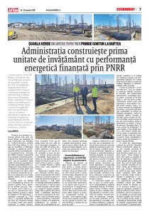Durata de execuție a lucrărilor este de 12 luni, iar echipe- le implicate respectă termenele asumate, sub monitorizarea permanentă a autorităților locale, pentru ca școala să fie fina- lizată în cele mai bune condiții. „Construirea acestei școli verzi reprezintă o nouă etapă în modernizarea orașului nostru. Este prima instituție de învățământ din Buftea concepută după principii sustenabile, cu accent pe eficiență energetică, confort și sănătatea copiilor. Investim în educație, pentru că știm că viitorul comunității noastre începe de aici, din școli moderne, sigure și prietenoase cu mediul”, a declarat primarul Gheorghe Pistol. În noua unitate de învățământ, fiecare detaliu a fost gândit pentru a oferi elevilor condiții optime de studiu și dezvoltare personală. Școala verde din Cartierul pentru Tineri completează o viziune amplă de dezvoltare urbană a orașului Buftea.