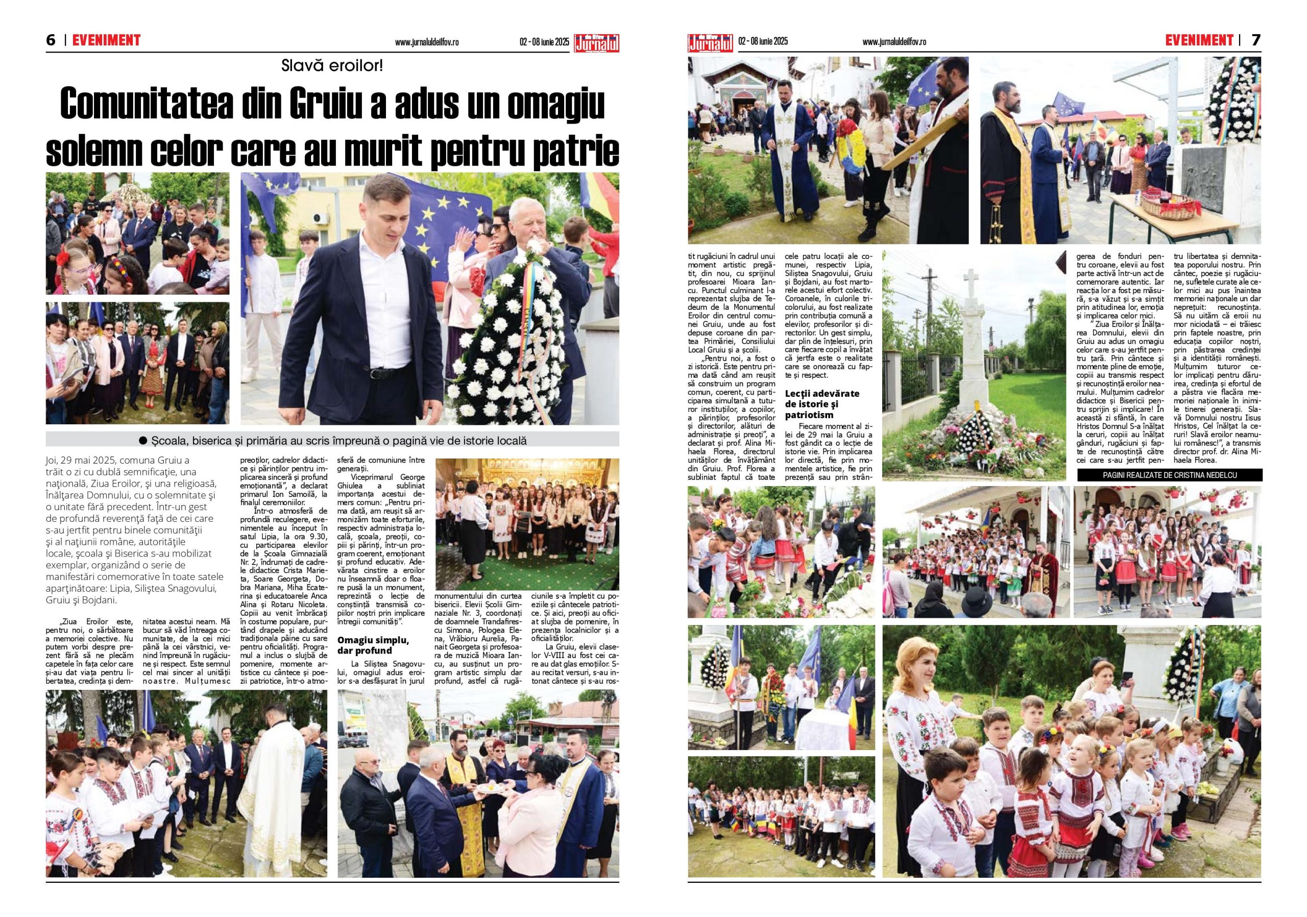 celor mici. ” Ziua Eroilor și Înălțarea Domnului, elevii din Gruiu au adus un omagiu celor care s-au jertfit pentru țară. Prin cântece și momente pline de emoție, copiii au transmis respect și recunoștință eroilor neamului. Mulțumim cadrelor didactice și Bisericii pentru sprijin și implicare! În această zi sfântă, în care Hristos Domnul S-a înălțat la ceruri, copiii au înălțat gânduri, rugăciuni și fapte de recunoștință către cei care s-au jertfit pentru libertatea și demnitatea poporului nostru. Prin cântec, poezie și rugăciune, sufletele curate ale celor mici au pus înaintea memoriei naționale un dar neprețuit: recunoștința. Să nu uităm că eroii nu mor niciodată – ei trăiesc prin faptele noastre, prin educația copiilor noștri, prin păstrarea credinței și a identității românești. Mulțumim tuturor celor implicați pentru dăruirea, credința și efortul de a păstra vie flacăra memoriei naționale în inimile tinerei generații. Slavă Domnului nostru Iisus Hristos, Cel înălțat la ceruri! Slavă eroilor neamului românesc!”, a transmis director prof. dr. Alina Mihaela Florea.