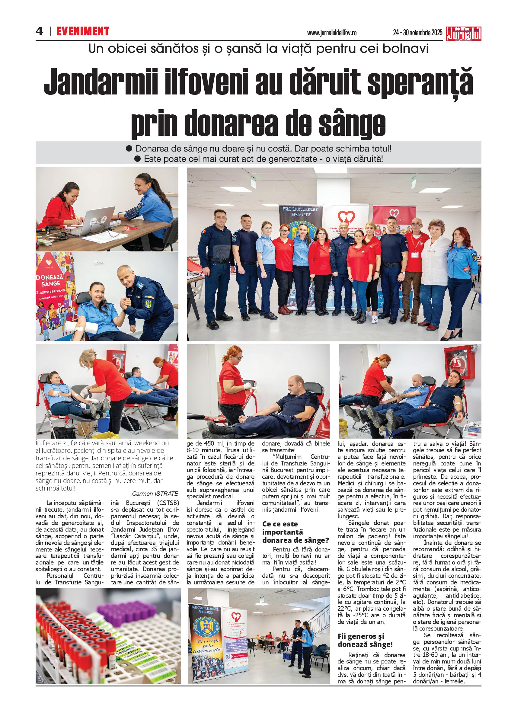 Personalul Centrului de Transfuzie Sanguină București (CSTSB) s-a deplasat cu tot echipamentul necesar, la sediul Inspectoratului de Jandarmi Județean Ilfov ”Lascăr Catargiu”, unde, după efectuarea triajului medical, circa 35 de jandarmi apți pentru donare au făcut acest gest de umanitate. Donarea propriu-zisă înseamnă colectare unei cantități