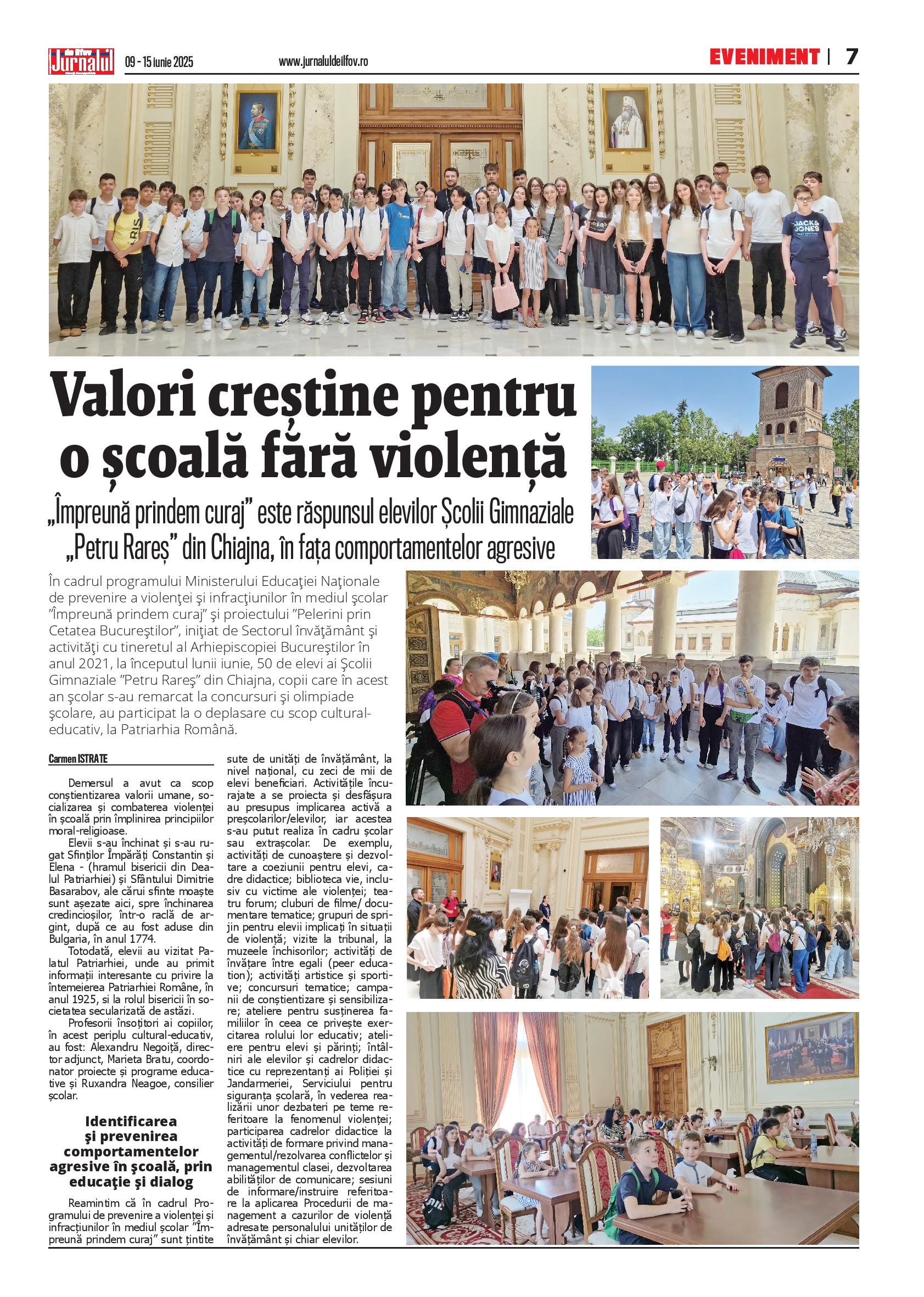 În cadrul programului Ministerului Educației Naționale de prevenire a violenței și infracțiunilor în mediul școlar ”Împreună prindem curaj” și proiectului ”Pelerini prin Cetatea Bucureștilor”, inițiat de Sectorul învățământ și activități cu tineretul al Arhiepiscopiei Bucureștilor în anul 2021, la începutul lunii iunie, 50 de elevi ai Școlii Gimnaziale ”Petru Rareș” din Chiajna, copii care în acest an școlar s-au remarcat la concursuri și olimpiade școlare, au participat la o deplasare cu scop cultural-educativ, la Patriarhia Română.