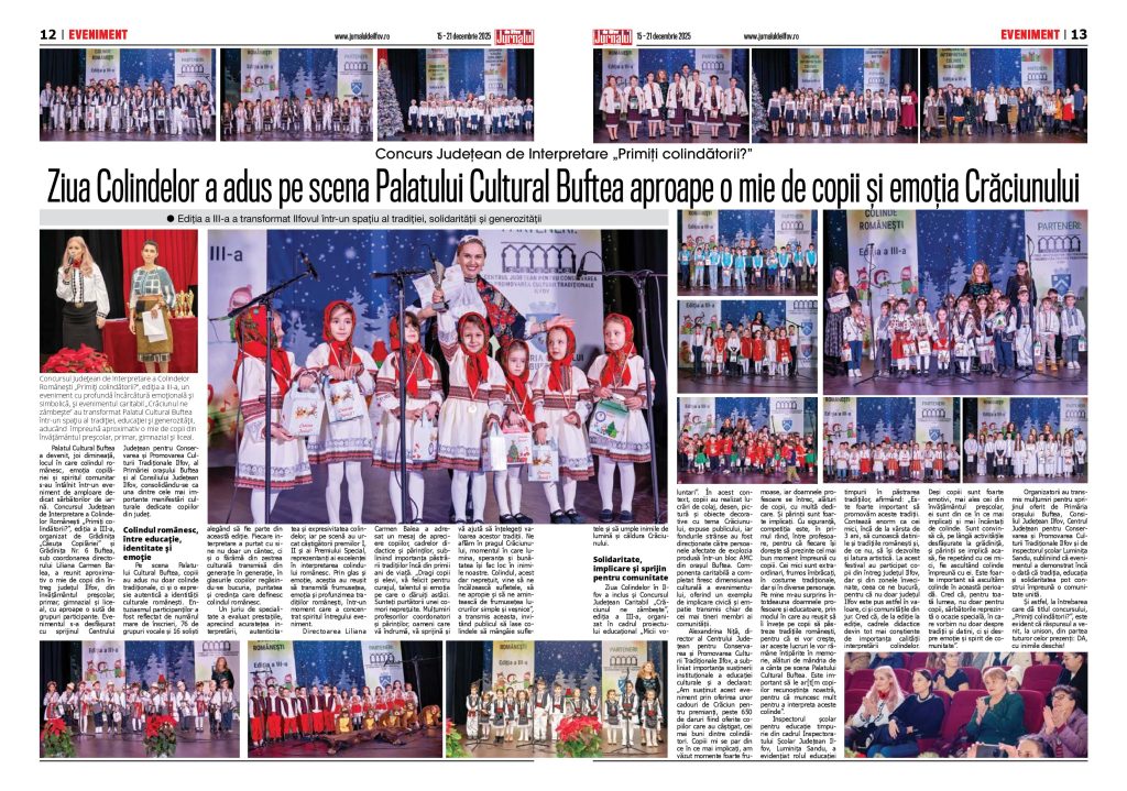 Palatul Cultural Buftea a devenit, joi dimineață, locul în care colindul românesc, emoția copilăriei și spiritul comunitar s-au întâlnit într-un eveniment de amploare dedicat sărbătorilor de iarnă. Concursul Județean de Interpretare a Colindelor Românești „Primiți colindătorii?”, ediția a III-a, organizat de Grădinița „Căsuța Copilăriei” și Grădinița Nr. 6 Buftea, sub coordonarea directorului Liliana Carmen Balea, a reunit aproximativ o mie de copii din întreg județul Ilfov, din învățământul preșcolar, primar, gimnazial și liceal, cu aproape o sută de grupuri participante. Evenimentul s-a desfășurat cu sprijinul Centrului Județean pentru Conservarea și Promovarea Culturii Tradiționale Ilfov, al Primăriei orașului Buftea și al Consiliului Județean Ilfov, consolidându-se ca una dintre cele mai importante manifestări culturale dedicate copiilor din județ.