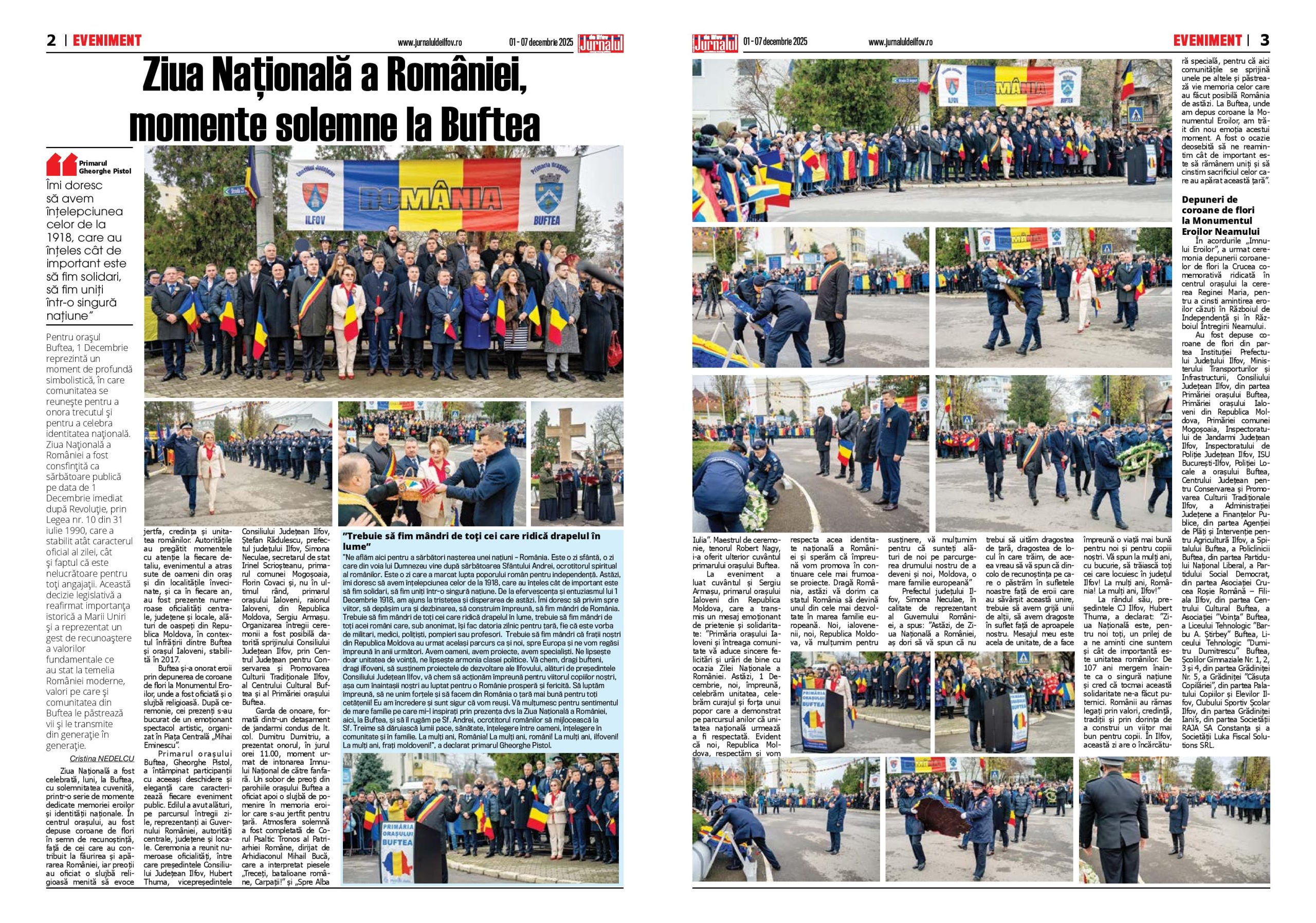 construi un viitor mai bun pentru copii. În Ilfov, această zi are o încărcătură specială, pentru că aici comunitățile se sprijină unele pe altele și păstrează vie memoria celor care au făcut posibilă România de astăzi. La Buftea, unde am depus coroane la Monumentul Eroilor, am trăit din nou emoția acestui moment. A fost o ocazie deosebită să ne reamintim cât de important este să rămânem uniți și să cinstim sacrificiul celor care au apărat această țară”.